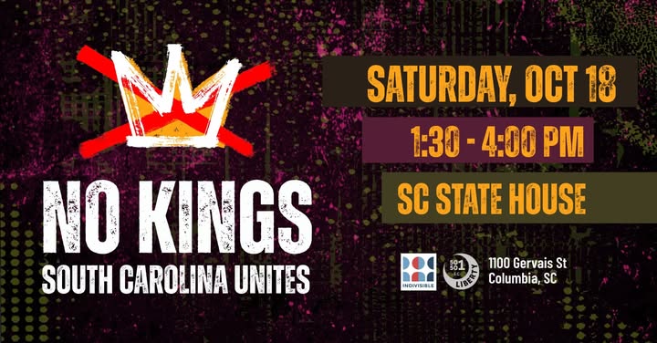 Join us for tabling at the No Kings Day: South Carolina Unites. We'll bring the clipboards and pens, you bring the enthusiasm and smiles!