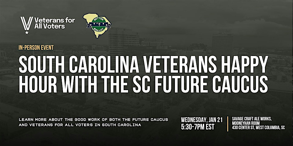 Come learn about the work of the Future Caucus and Veterans for South Carolina Voters. Meet fellow community members who share a commitment to strengthening civic leadership and improving how our political system serves every voter in the state.